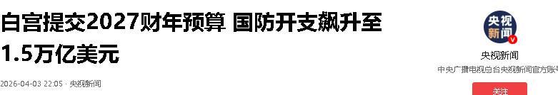 4月3日,白宫正式向国会提交2027财年预算提案,国防预算高达1.5万亿美元,较上一财年激增4450亿美元,增幅创二战结束以来最高,是近几十年美国申请的最大规模国防预算。
